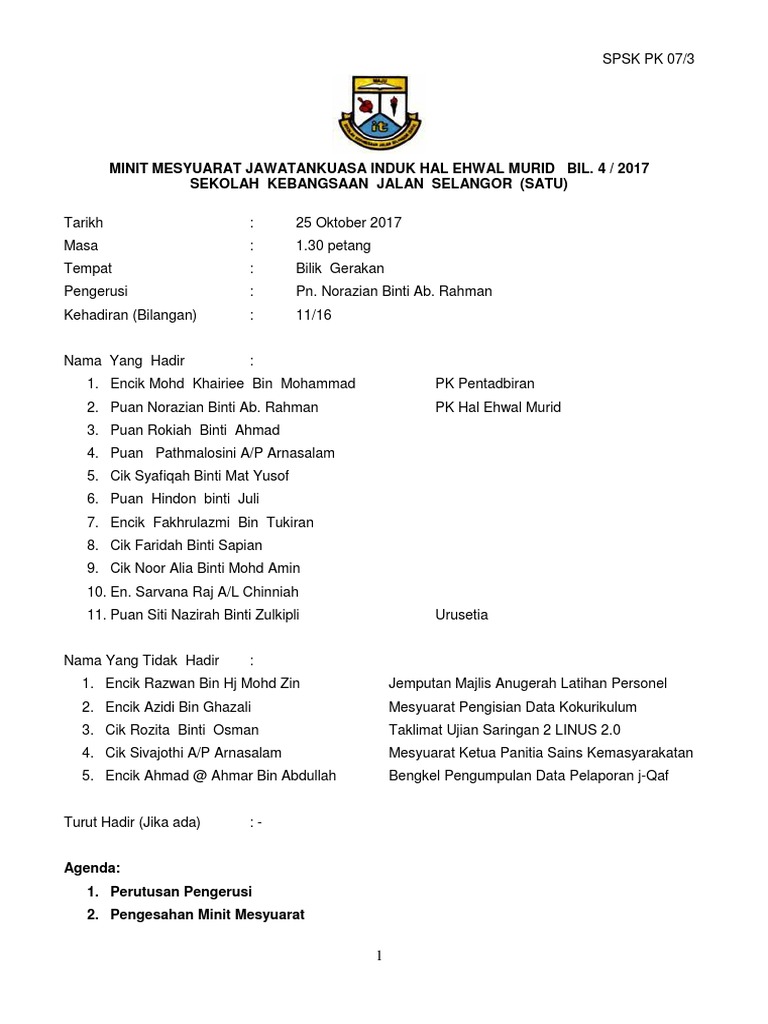 Bilik gerakan 2 skskt para. No.keluaran tarikh keluaran no.pindaan tarikh pindaan tarikh berkuatkuasa 06 01 disember. Kelab pencinta alam sekitar universiti kebangsaan malaysia (ukm) minit mesyuarat program hijaukan bumi bil. Sehubungan dengan itu, anda boleh memuat turun minit mesyuarat bagi pengurusan sekolah pada ruangan muat turun yang telah. Kepada semua ajk minit mesyuarat dan borang maklum balas boleh di muat turun di bawah: