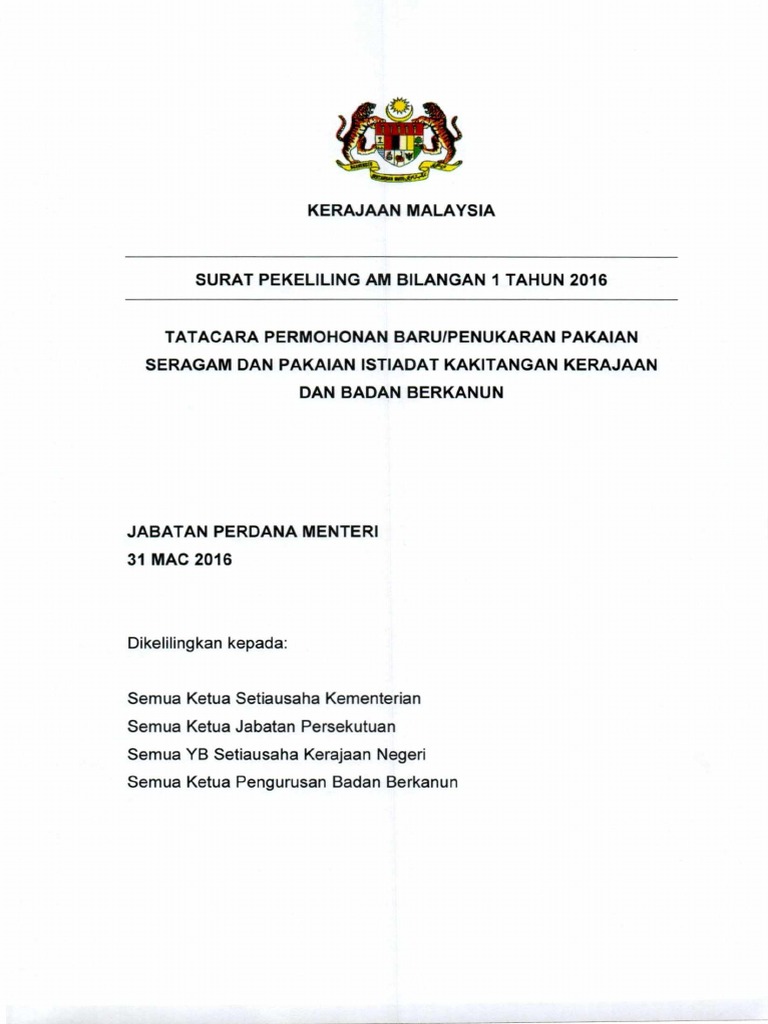 Surat Pekeliling Am Bilangan 1 Tahun 2016 Tatacara Permohonan Baru Penukaran Pakaian Seragam Dan Pakaian Istiadat Kakitangan Kerajaan Dan Badan Berkanun from imgv2-1-f.scribdassets.com Kerajaan malaysia surat pekeliling suruhanjaya perkhidmatan awam. Pemakaian pekeliling perkhidmatan bilangan 1 tahun 2020. Rasionalisasi skim perkhidmatan bagi perkhidmatan awam persekutuan di bawah sistem saraan malaysia berkuat kuasa mulai 1 julai 2016. Pdf surat pekeliling ikhtisas bilangan 5 tahun 2016 panduan keselamatan semasa pengajaran pendidikan jasmani dn kesihatan serta kegiatan kokurikulum dan sukan di dalam dan di luar kawasan sekolah ( pdf, 3.01 mb ) (15394 muat turun) popular. 12 khidmat nasihat sebarang kemusykilan berkaitan dengan pekeliling ini dan garis panduan mengenai tatacara penggunaan internet dan mel elektronik bolehlah dirujuk kepada mampu. Ensure words are spelled correctly. Surat pekeliling ikhtisas bilangan 2 tahun 2016 standard kecergasan fizikal kebangsaan untuk murid sekolah malaysia (segak). Pekeliling pensijilan halal malaysia bilangan 1 tahun 2016.